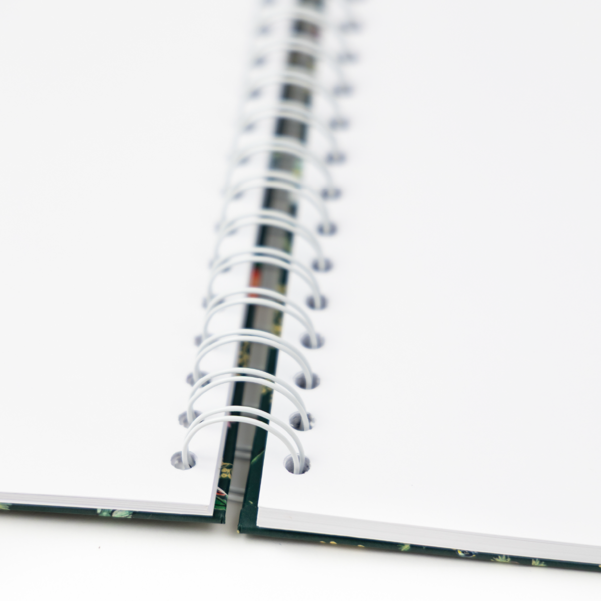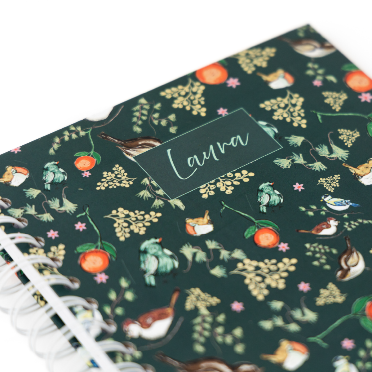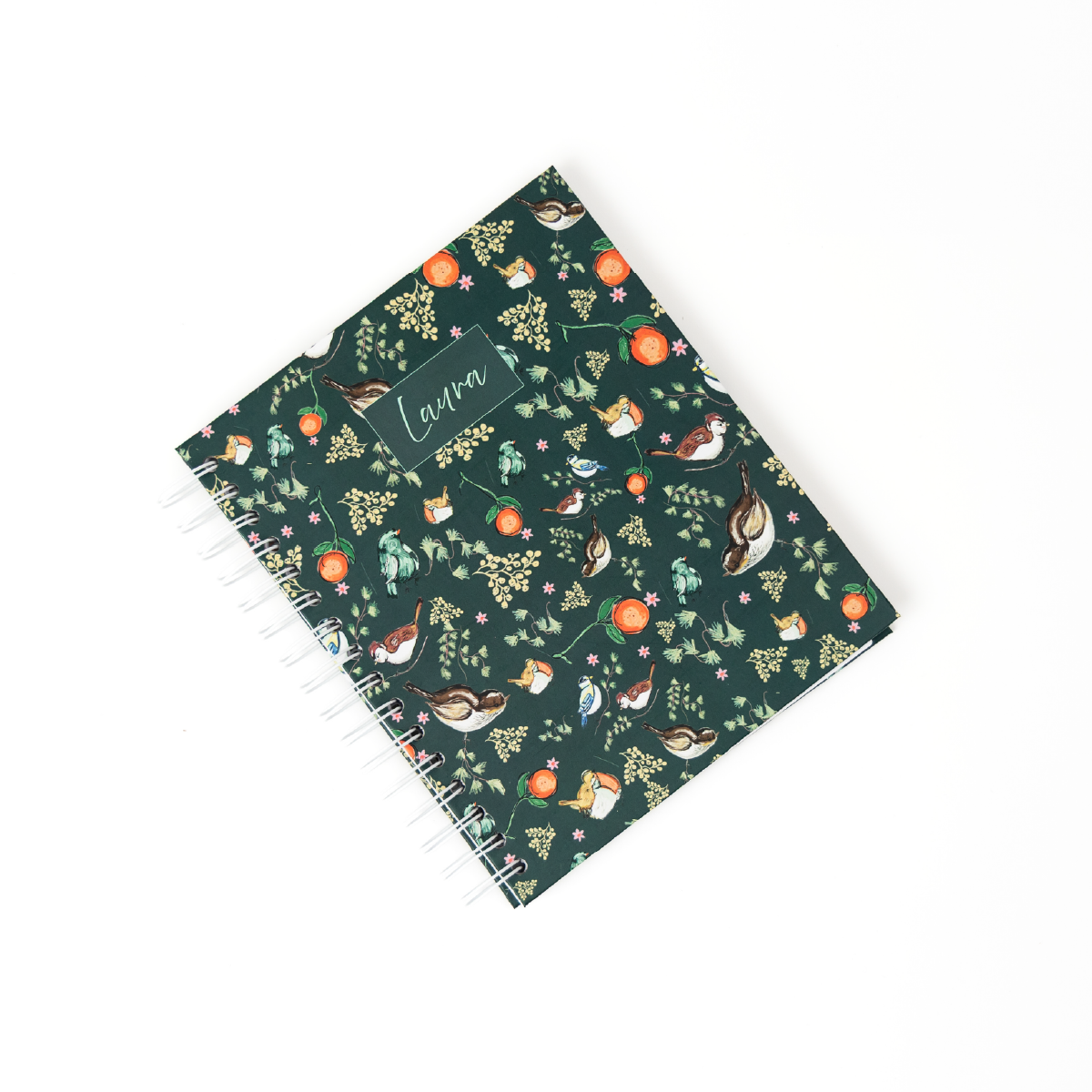 Cuaderno con patrón botánico de aves y naranjas sobre fondo verde oscuro.