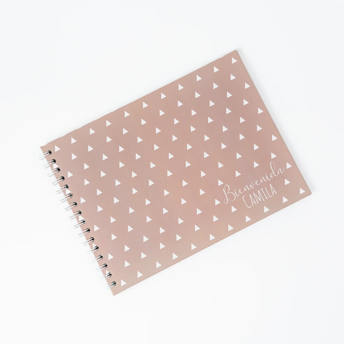 Babybook con triángulos en tonos rosados, pensado para acompañar a tu bebé.