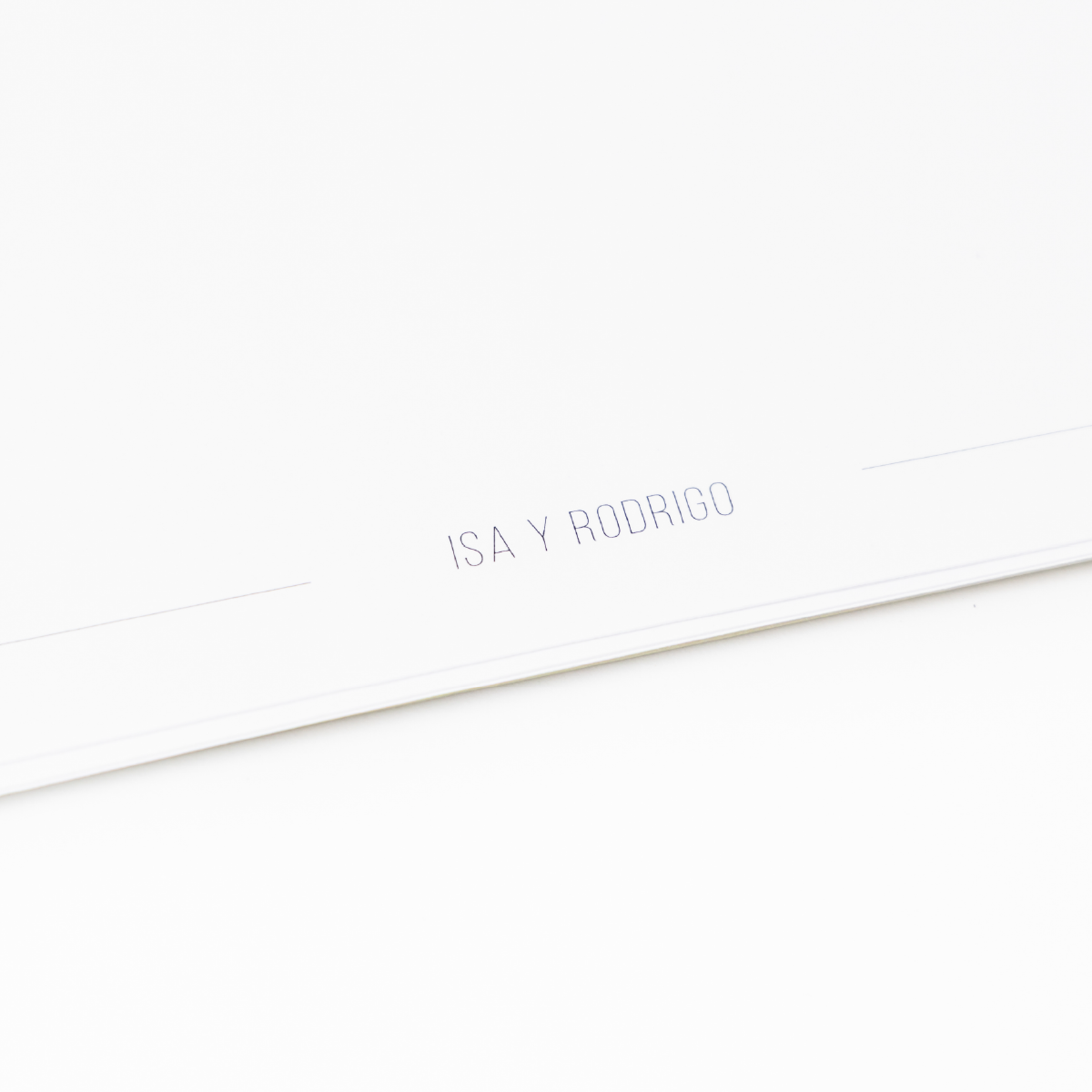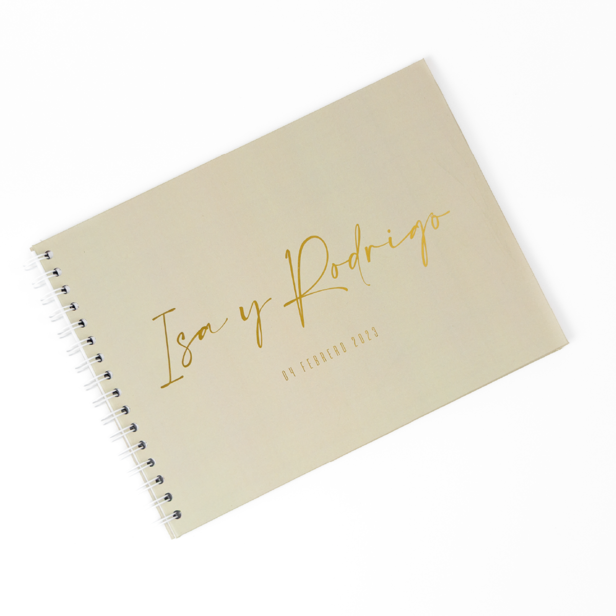 Portada rígida personalizable con nombres, fecha y diseño especial.
