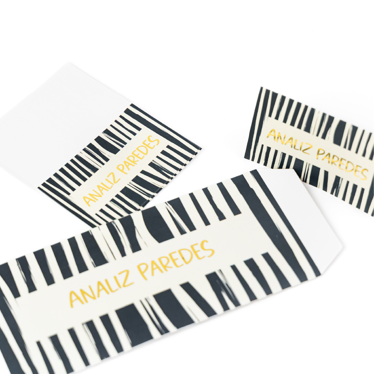 Diseño statement con rayas abstractas en blanco y negro, con el nombre realzado en cálido Foil Dorado.