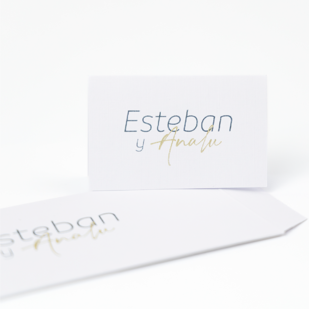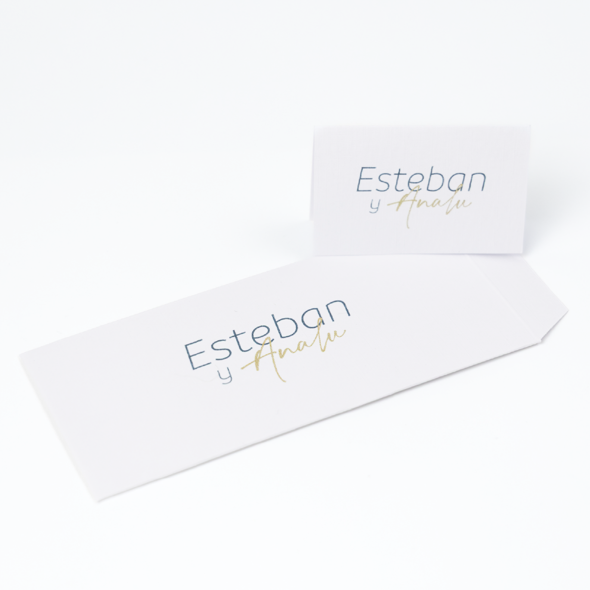 Cada tarjeta y sobre lleva el nombre impreso con una tipografía delicada, sobre papel de alta calidad. Además, incluye stickers autoadhesivos para cerrar los sobres con un toque sofisticado.