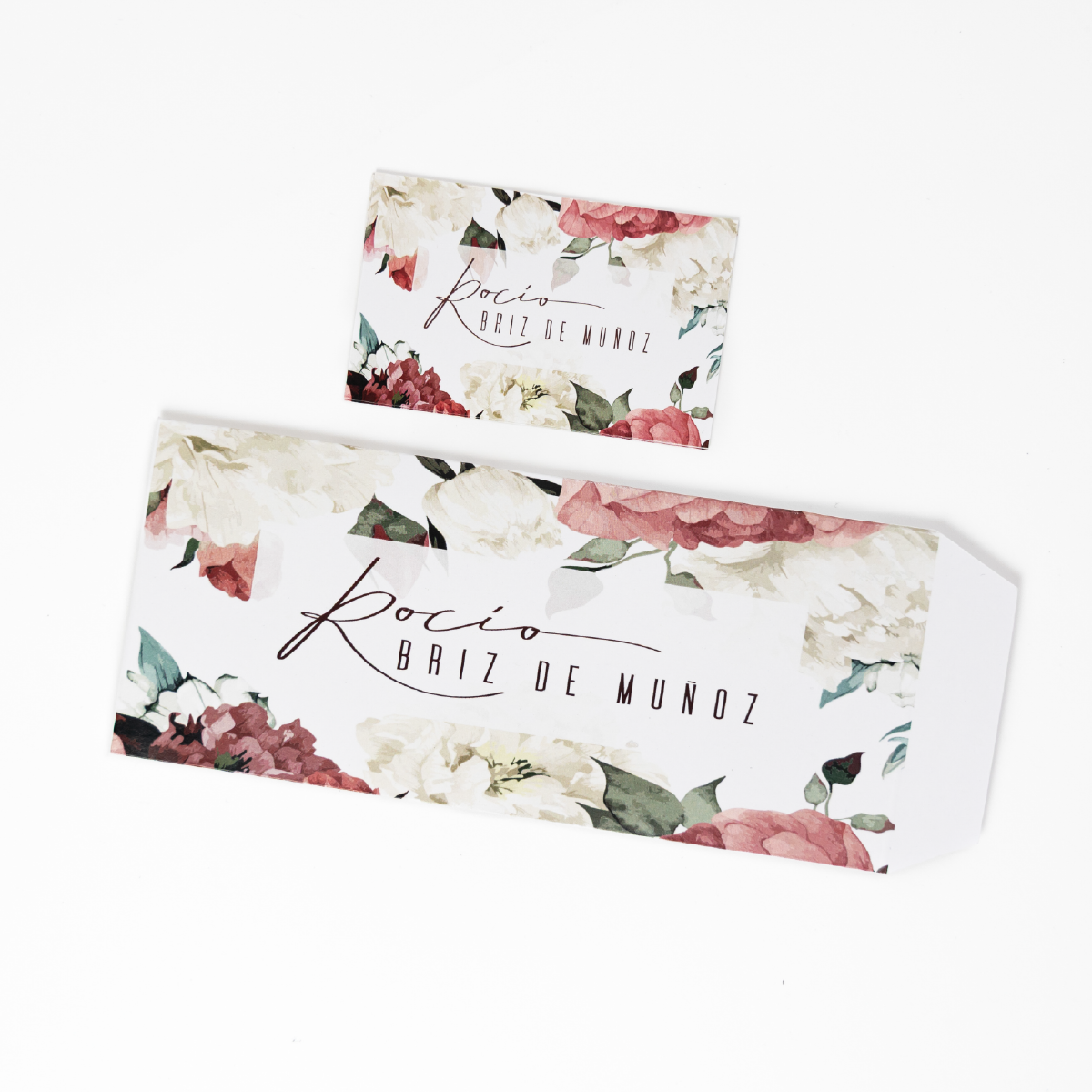 Cada tarjeta y sobre lleva el nombre impreso con una tipografía delicada, sobre papel de alta calidad. Además, incluye stickers autoadhesivos para cerrar los sobres con un toque sofisticado.