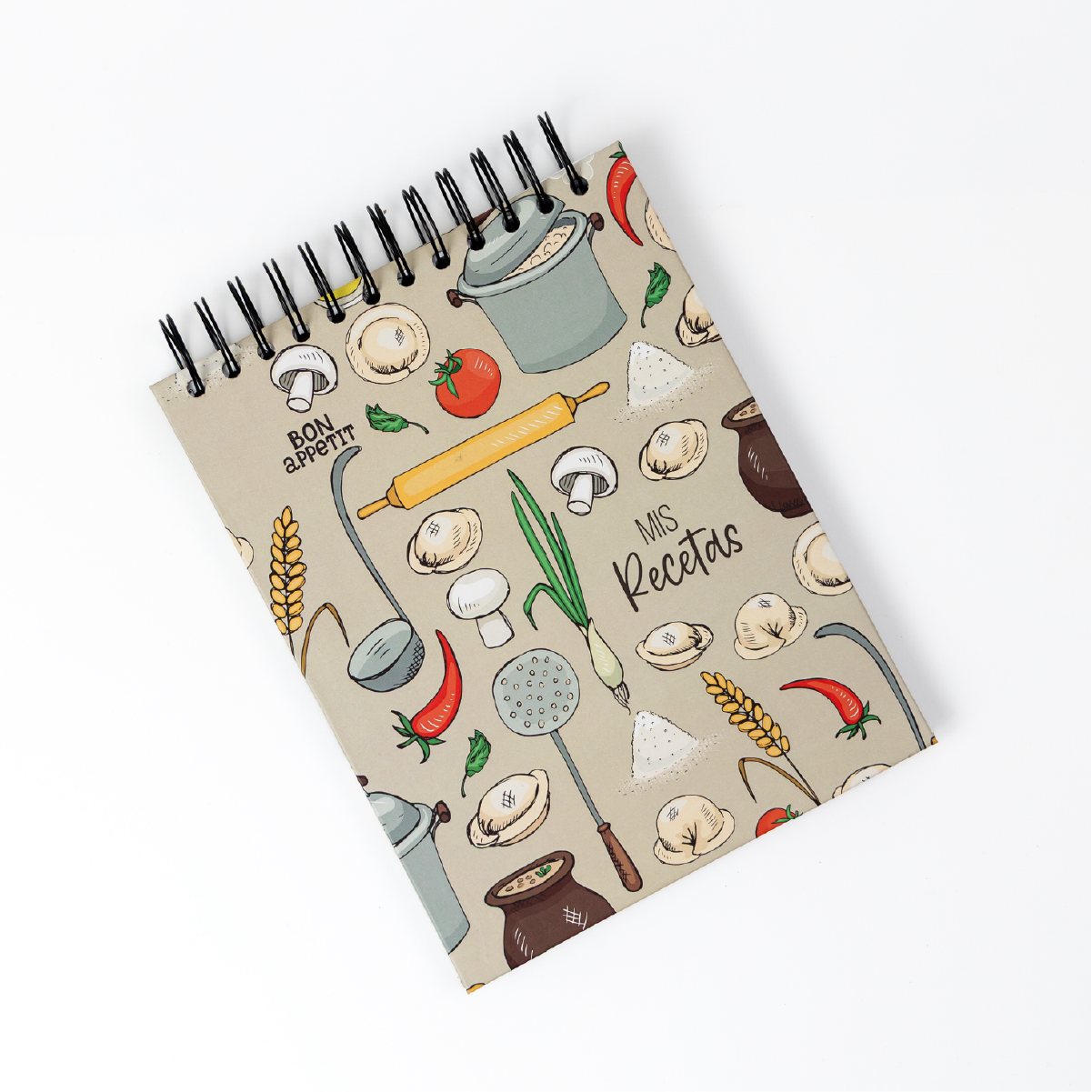 Recetario de cocina personalizado con espiral y diseño Bon Appétit, ideal para anotar y organizar tus recetas favoritas con estilo y practicidad.