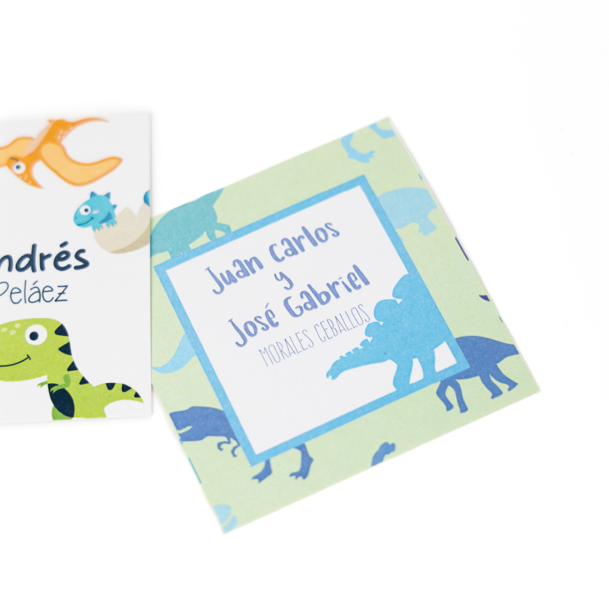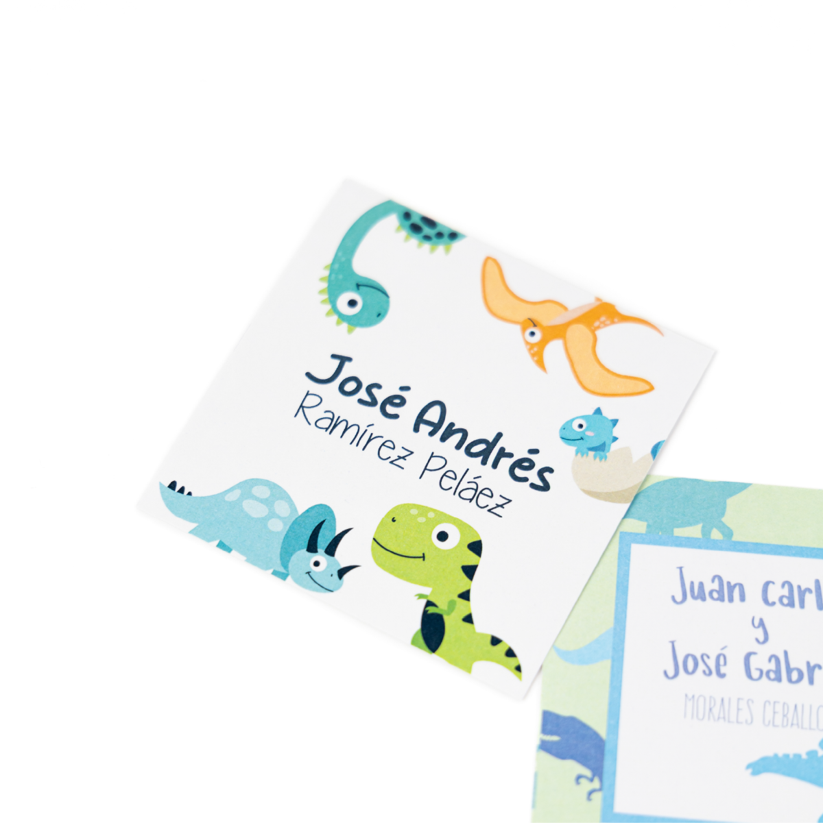 Estas tarjetas cuadradas simples son el complemento perfecto para cualquier fiesta o regalo con temática de dinosaurios. El diseño ofrece dos opciones: ilustraciones de dinosaurios en colores vibrantes sobre fondo blanco, o un patrón más gráfico en tonos azules y verdes. Impresas sobre papel liso de alta calidad, son fáciles de escribir en el reverso y perfectas para adjuntar a obsequios o usarlas como tarjetas de agradecimiento post-evento. Se personalizan completamente con el nombre del niño o niña, el apellido o incluso un mensaje corto. ¡Añade un toque jurásico y divertido a cualquier detalle!