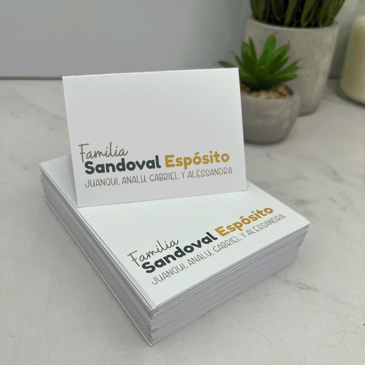 Tarjetas dobles personalizadas con nombres, impresas en materiales premium como, opalina o lino. ¡Perfectas para acompañar tus regalos!